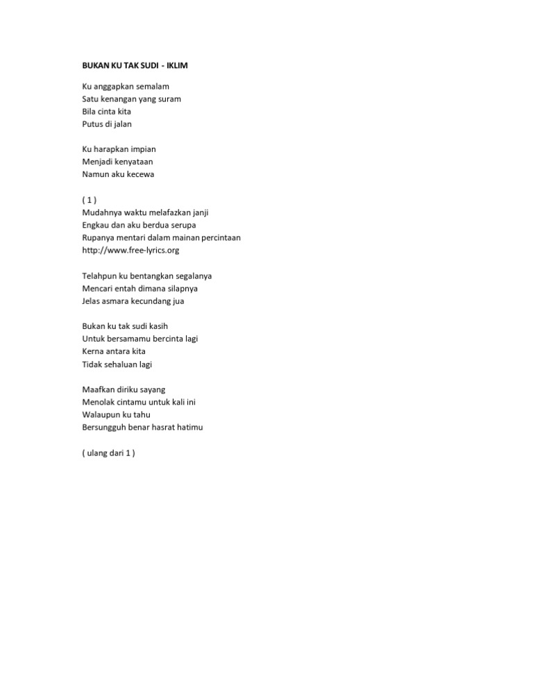 Berikut ini merupakan chord gitar dan lirik lagu Bukan Ku Tak Sudi yang dinyanyikan oleh Iklim. Iklim - Bukan Aku Tak Sudi Chord Easy Chord Adakah Chord Ini Tidak Boleh Transpose. Show all chords diagrams Saleem Iklim - Bukan Aku Tak Sudi Intro.